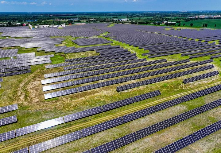 2024年7月19日拍攝的內(nèi)蒙古通遼發(fā)電總廠光伏電站(無人機(jī)照片)。新華社記者 連振 攝