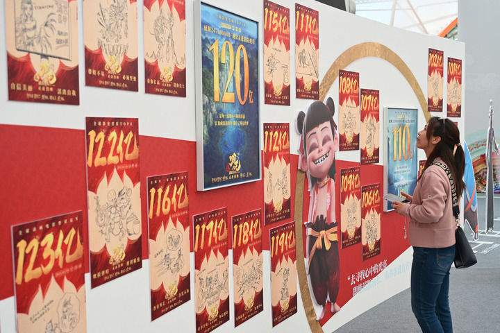 2025年4月19日,觀眾在電影《哪吒之魔童鬧海》手繪海報(bào)展上參觀。新華社記者 李鑫 攝